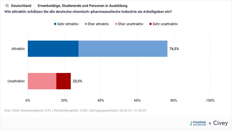 Obwohl die Zahl der Arbeitslosen im August erstmals seit 10 Jahren wieder über die Marke von 3 Millionen gestiegen ist, gibt es auch erste Anzeichen einer konjunkturellen Erholung. Der Wettbewerb der Branchen um gute Mitarbeiterinnen und Mitarbeiter wird sich fortsetzen. Die deutsche Pharmabranche geht mit einem Vorteil in den Wettbewerb um gute Leute. Sie zählt weiterhin zu den attraktivsten Arbeitgebern des Landes. Das zeigt eine aktuelle Civey-Umfrage (Stand: 31.08.2025) im Auftrag von Pharma Deutschland: Drei von vier Erwerbstätigen, Studierenden und Auszubildenden (76,5 Prozent) bewerten den Arzneimittelsektor als attraktiven Arbeitgeber.