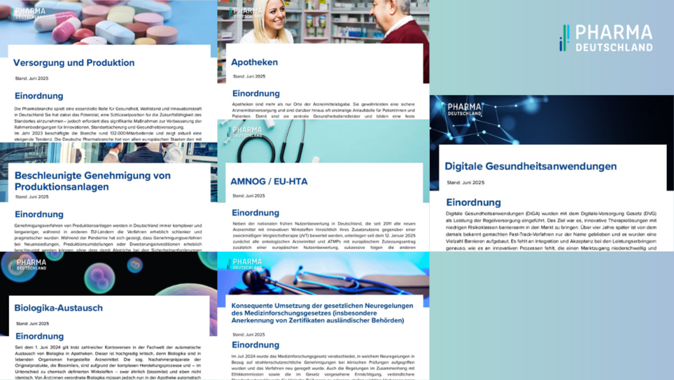 Die Pharmaindustrie ist eine gesunde, permanent innovative, hochrelevante Industrie mit starker Wertschöpfung. Pharma Deutschland sorgt dafür, dass die Pharmabranche im Gesundheitsbereich, in der Politik und der Öffentlichkeit als Leitbranche wahrgenommen wird. Dabei ist die Unterstützung unserer Mitgliedsunternehmen unser wichtigster Erfolgsfaktor.