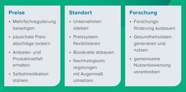 Drei Themen stehen dabei besonders im Fokus: Exzessiver Preisdruck, der die deutschlandweite Versorgung von Patientinnen und Patienten mit Arzneimitteln und Medizinprodukten akut gefährdet. Standortfaktoren, die es den Unternehmen immer schwerer machen, zu forschen, zu entwickeln, zu produzieren und (neue) Produkte auf den Markt zu bringen. Innovationsskepsis, die die Chancen des medizinischen Fortschritts ausbremst.