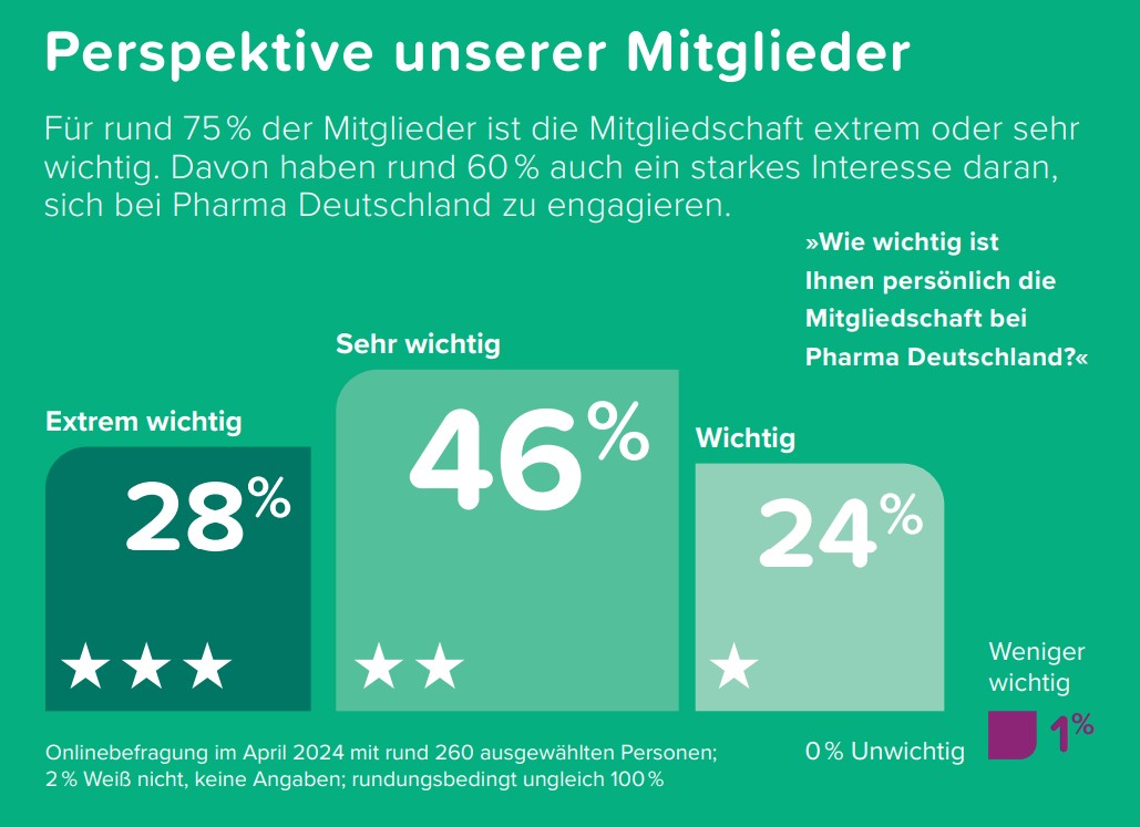 About 75% of members, membership is extremely or very important. Of these, around 60% are also very interested in getting involved in Pharma Deutschland.