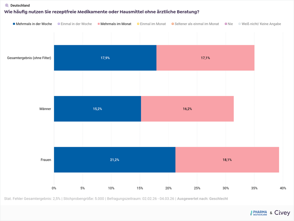 Frauen greifen deutlich häufiger eigenverantwortlich zu rezeptfreien Medikamenten als Männer (mehrmals pro Woche mehrmals pro Monat tun dies kumuliert 39% der Frauen vs. 31% der Männer).