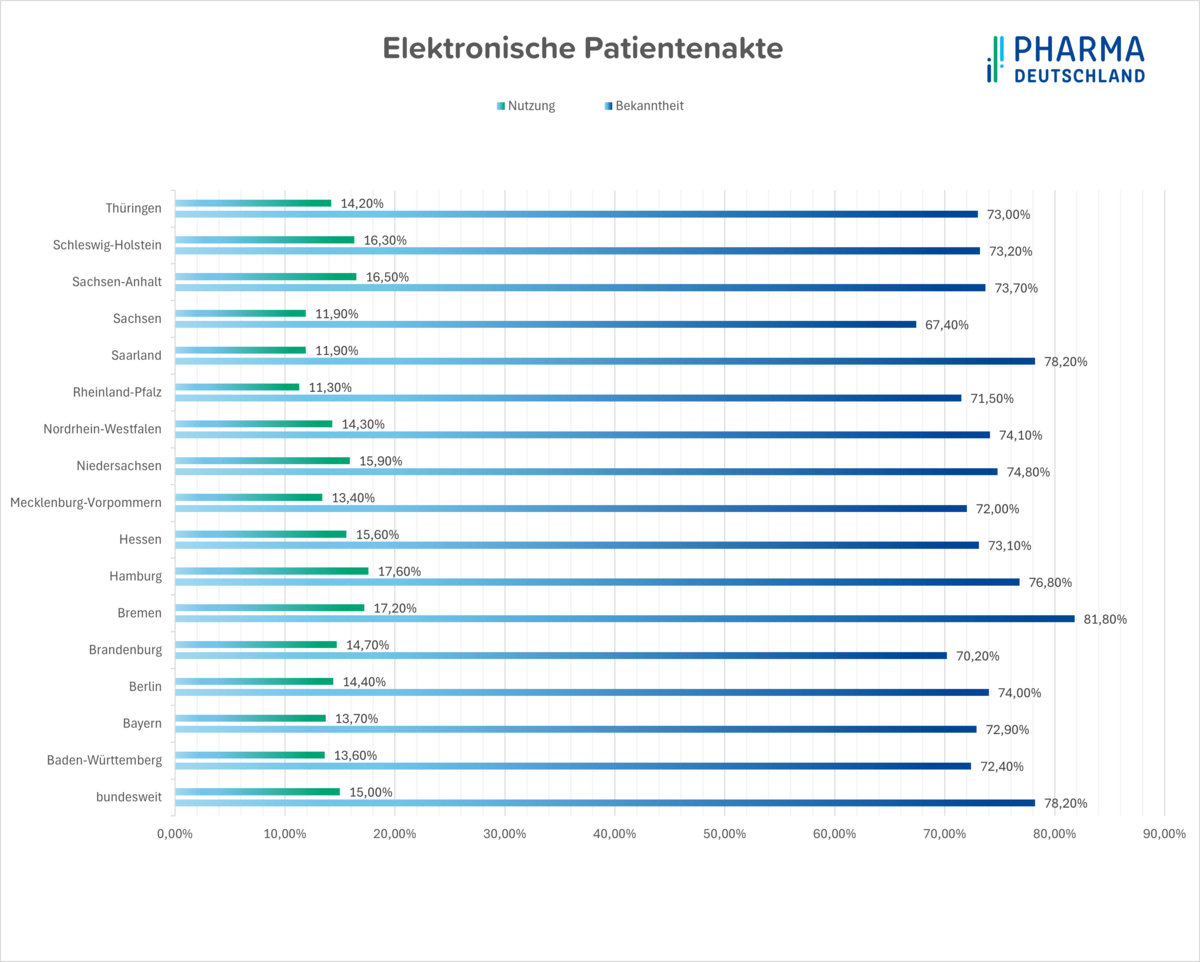 Das E-Rezept ist mittlerweile bundesweit rund 86 Prozent der Bevölkerung dem Namen nach bekannt, jedoch haben erst 60 Prozent es tatsächlich genutzt. Bei der elektronischen Patientenakte (ePA), die Anfang dieses Jahres eingeführt wurde, zeigt sich ein ähnliches Bild: Zwar kennen bereits 78 Prozent die ePA, aber nur 18 Prozent nutzen sie aktiv.