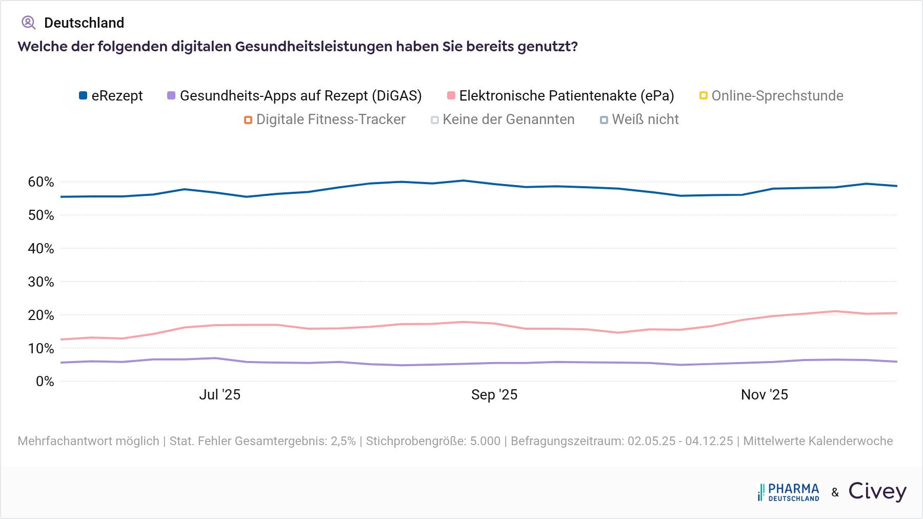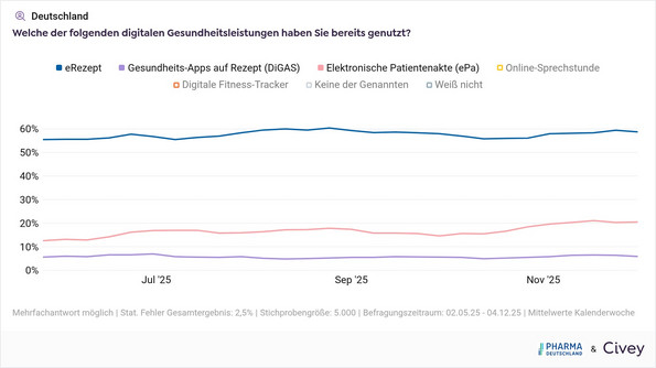 Mit 86,9 Prozent Bekanntheit und knapp 60 Prozent Nutzung ist das E-Rezept die etablierteste digitale Anwendung im Gesundheitswesen. Allerdings stieg die Zahl der Nutzer in den vergangenen sechs Monaten nur leicht von 55,7 Prozent auf 59,3 Prozent (Stand: 04.12.2025). Die elektronische Patientenakte (ePA) verzeichnete hingegen einen deutlicheren Zuwachs: Von 12,1 Prozent im Juni auf 20,3 Prozent Anfang Dezember. Die Gesundheits-Apps auf Rezept (DiGAs) sind weniger als einem Drittel der Bevölkerung (27,0 Prozent) bekannt und werden lediglich von 5,4 Prozent genutzt.
