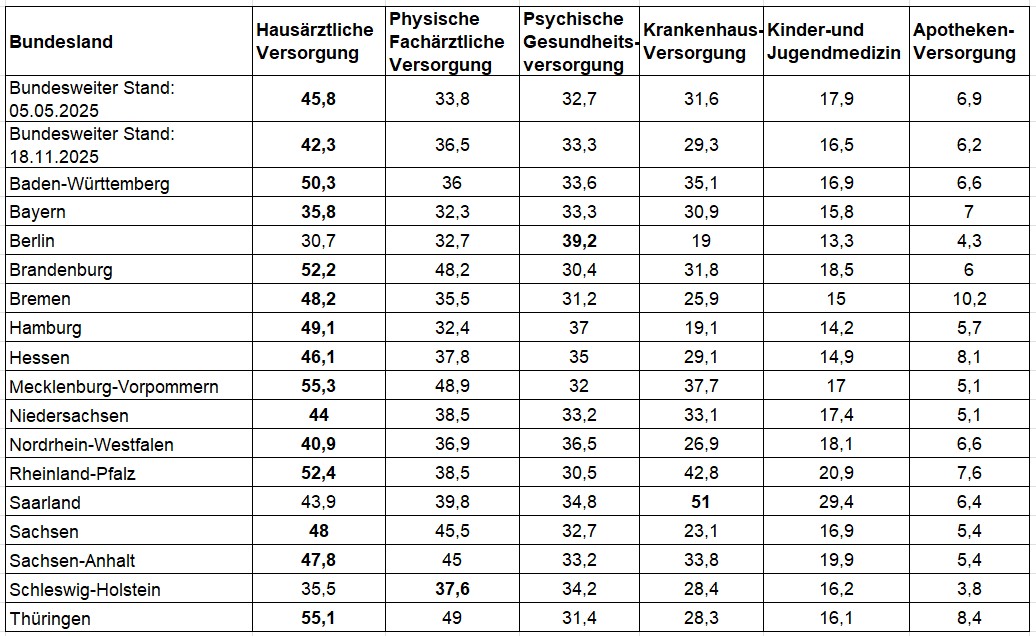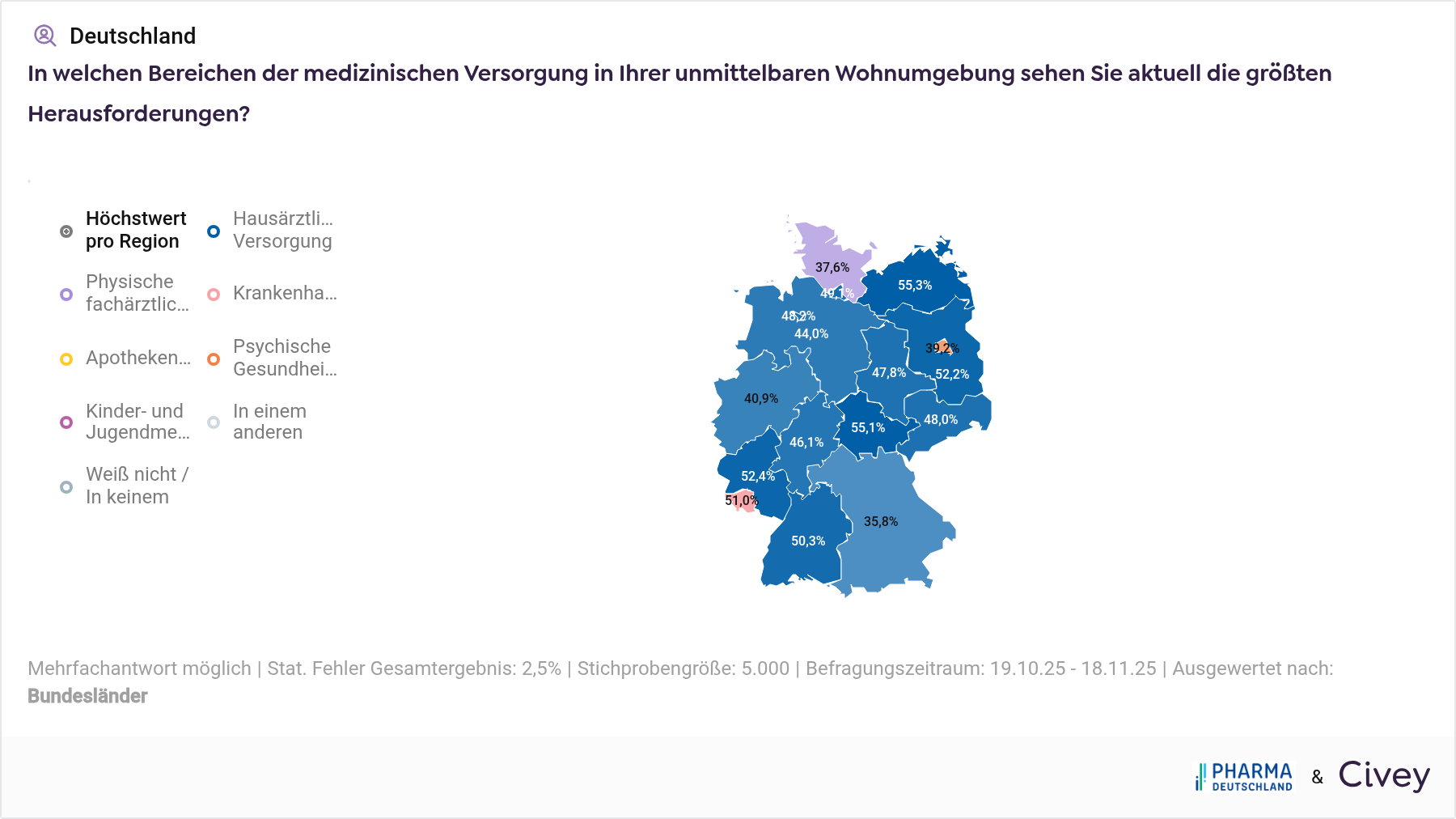 Darüber hinaus sind die von Bürgerinnen und Bürgern empfundenen Herausforderungen der alltäglichen Gesundheitsversorgung im Vergleich zum Frühjahr (siehe Pressemitteilung vom 14. Mai 2025) weitestgehend gleichgeblieben. Wie schon im Mai sehen aktuell (Stand: 18.11.2025) bundesweit die meisten Befragten die hausärztliche Versorgung als größte Herausforderung im Alltag (42,3 Prozent). Dies zieht sich mit Ausnahme der Vierzig- bis Neunundvierzig-Jährigen durch alle Altersgruppen sowie durch die Geschlechter. Bundesweit folgen die physische fachärztliche Versorgung (36,5 Prozent), die psychische Gesundheitsversorgung (33,3 Prozent) und die Krankenhausversorgung (29,3 Prozent).