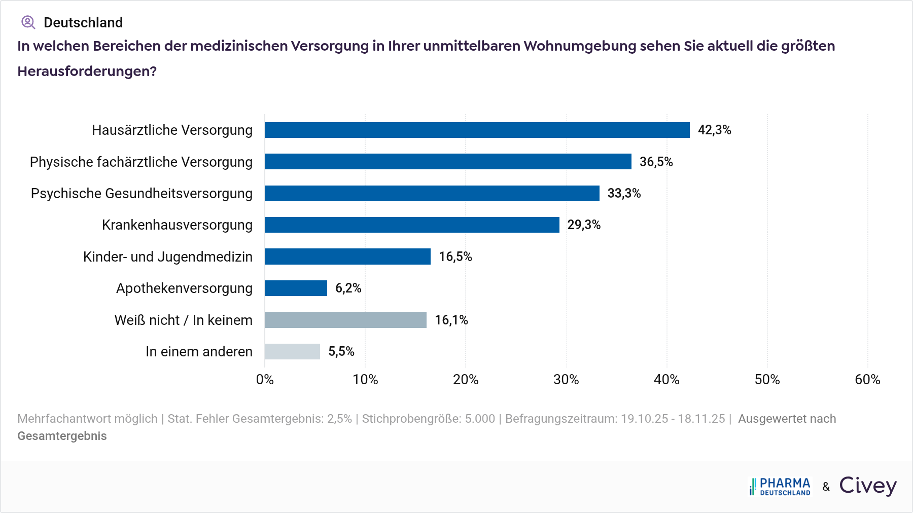 Frage: In welchen Bereichen der medizinischen Versorgung in Ihrer unmittelbaren Wohnumgebung sehen Sie aktuell die größten Herausforderungen? (Befragungszeitraum: 19.10.2025 bis 18.11.2025; Stichprobengröße: 5000; Angaben in Prozent)