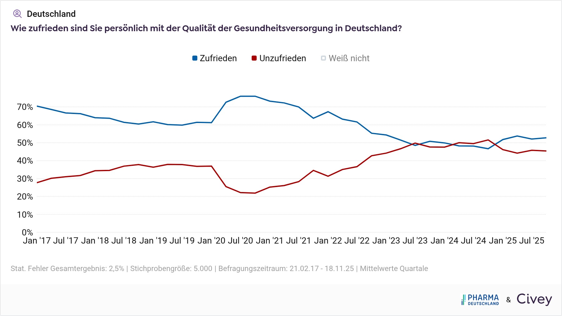 Ein halbes Jahr nach Amtsantritt der neuen Bundesregierung nehmen Bürgerinnen und Bürger weiterhin große Probleme in der alltäglichen Gesundheitsversorgung war. Dies geht aus zwei repräsentativen CIVEY-Umfragen im Auftrag von Pharma Deutschland hervor. Trotz einer Verbesserung im Vergleich zum Vorjahr geben demnach weiterhin 45,3 Prozent der Befragten an, mit der Qualität der Gesundheitsversorgung in Deutschland insgesamt unzufrieden zu sein (Stand: 18.11.2025).