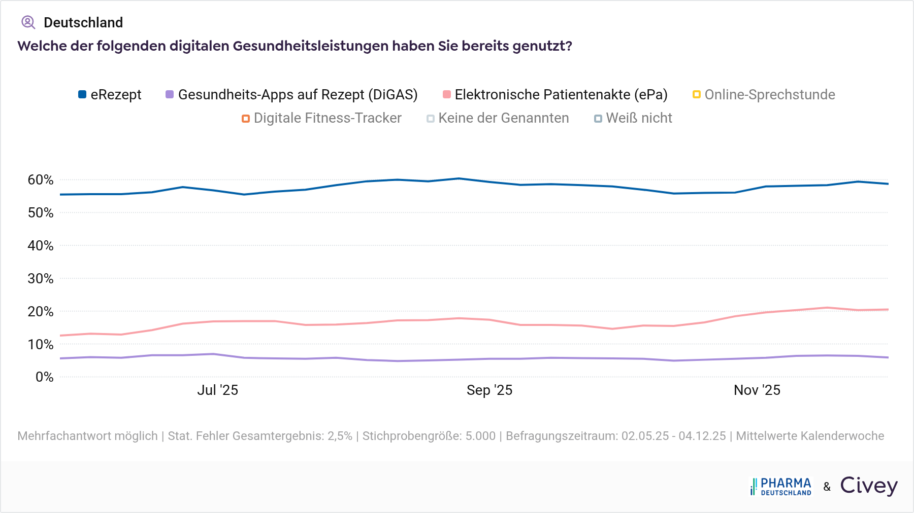 Die Digitalisierung des deutschen Gesundheitswesens kommt schwer voran. Mehr als vier Jahre nach der Einführung der Gesundheitsanwendungen auf Rezept (DiGAs), fast zwei Jahre nach der verbindlichen Einführung des E-Rezeptes und gut zehn Wochen nach dem Start der verpflichtenden Nutzung der elektronischen Patientenakte (ePA) durch Leistungserbringer, verharren die Nutzerzahlen für alle drei digitalen Gesundheitsanwendungen deutlich unter ihrem Bekanntheitsgrad. Das ist die zentrale Erkenntnis einer aktuellen Civey-Umfrage in Auftrag von Pharma Deutschland.
