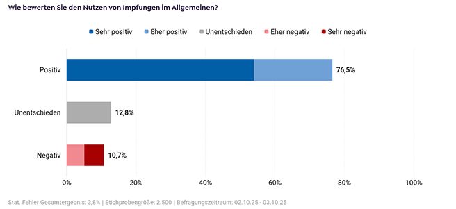 Noch kritischer sieht es bei der COVID-19-Impfung aus: Nur noch 21,8 Prozent der Befragten planen eine Impfung in diesem Jahr, was als deutlicher Rückgang gegenüber dem Vorjahr zu verzeichnen ist (2024: 27,8 Prozent) – und das, obwohl die Mehrheit der Befragten Impfungen generell als nützlich einschätzt. So gaben 76,5 Prozent der Teilnehmenden an, einen positiven Nutzen in Impfungen zu sehen.