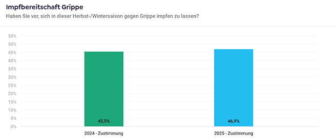 Nicht mal mehr die Hälfte der Befragten (46,9 Prozent) gaben an, sich in dieser Herbst-/Wintersaison gegen Grippe impfen lassen zu wollen. Der Wert verharrt auf einem niedrigen Niveau (im Vergleich zu 2024: 45,5 Prozent).