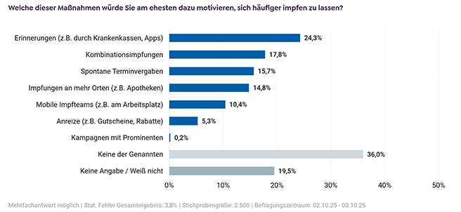 Auf die Frage nach Maßnahmen, die zu einer Impfung motivieren würden, nannten die Befragten neben praktischen und leicht zugänglichen Angeboten vor allem Erinnerungen an benötigte Impfungen: