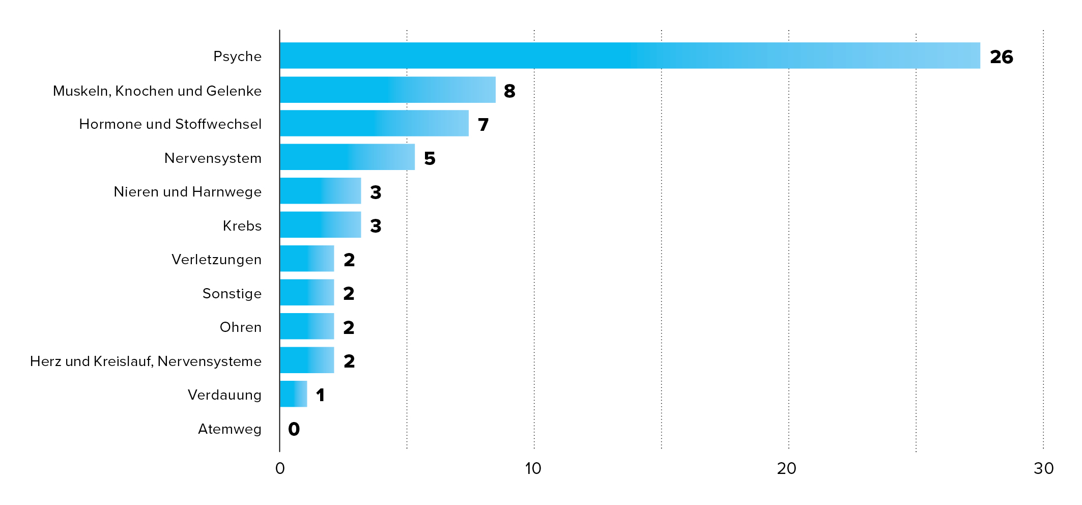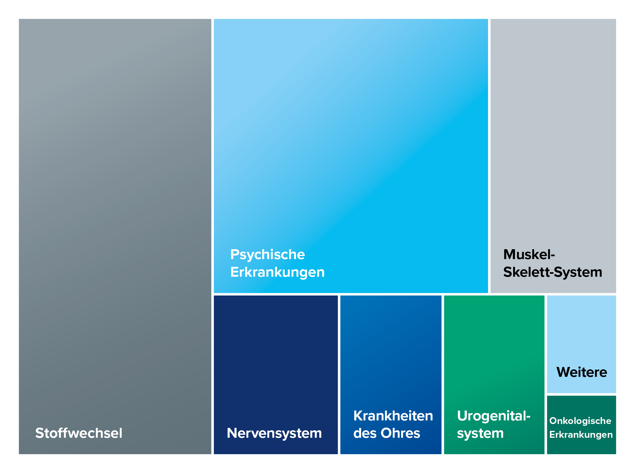 Der Großteil der DiGA ist für den Anwendungsbereich der Psyche verfügbar. Gefolgt werden diese von DiGA im Bereich der Hormone und Stoffwechsel-assoziierten Krankheiten. DiGA im Indikationsgebiet der Muskeln, Knochen und Gelenke haben zugenommen.