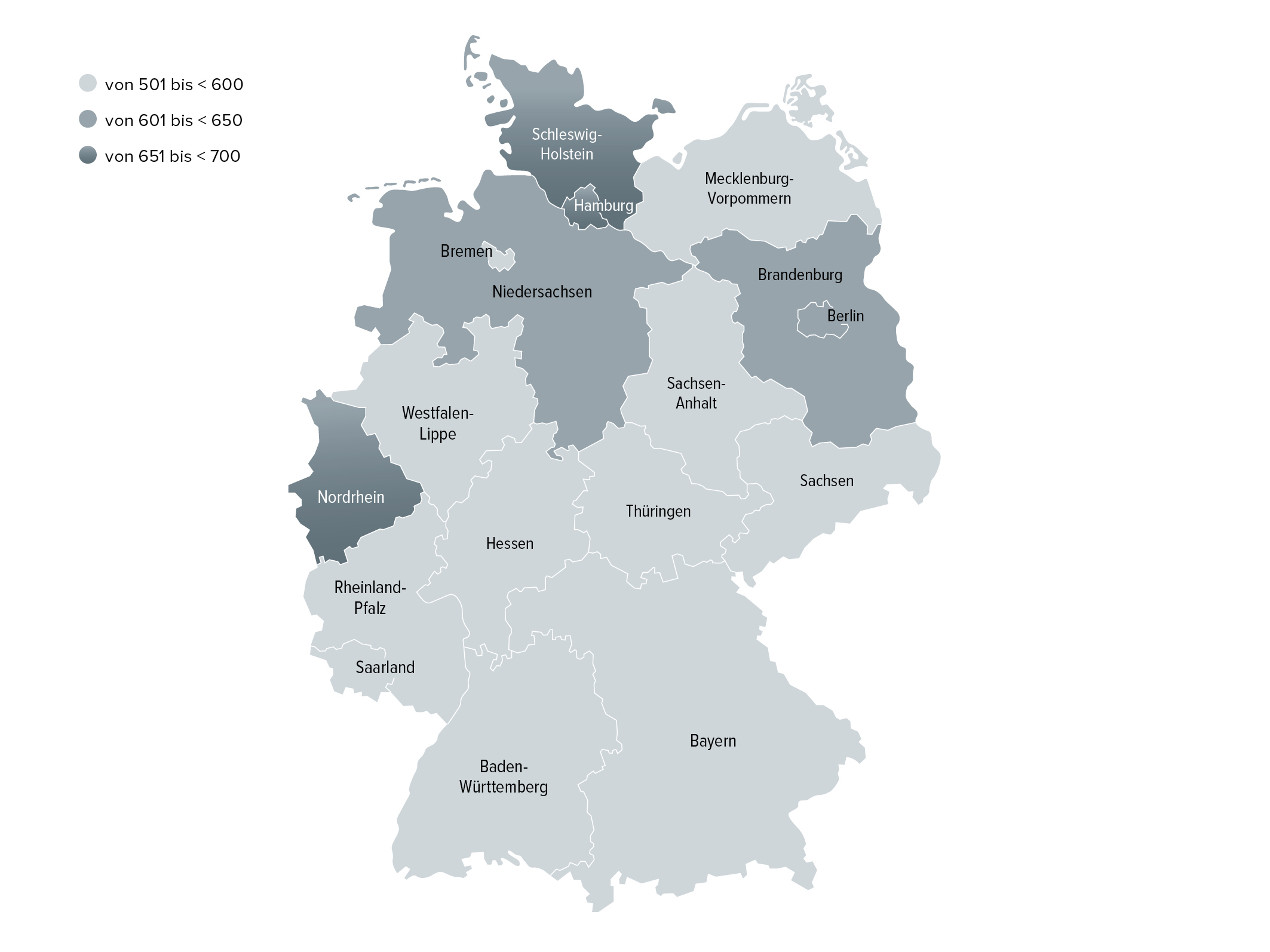 Im regionalen Vergleich gibt es eine Angleichung bestimmter Bundesländer, wie Schleswig-Holstein und Nordrhein, zu den Metropolen Berlin und Hamburg mit der bisher stärksten Inanspruchnahme von DiGA.