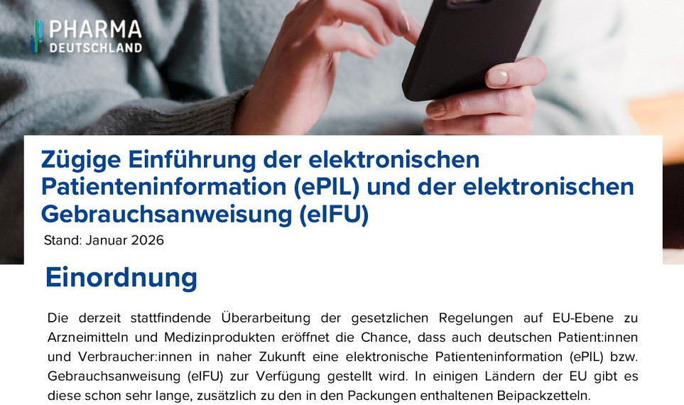 Die derzeit stattfindende Überarbeitung der gesetzlichen Regelungen auf EU-Ebene zu Arzneimitteln und Medizinprodukten eröffnet die Chance, dass auch deutschen Patient:innen und Verbraucher:innen in naher Zukunft eine elektronische Patienteninformation (ePIL) bzw. Gebrauchsanweisung (eIFU) zur Verfügung gestellt wird.