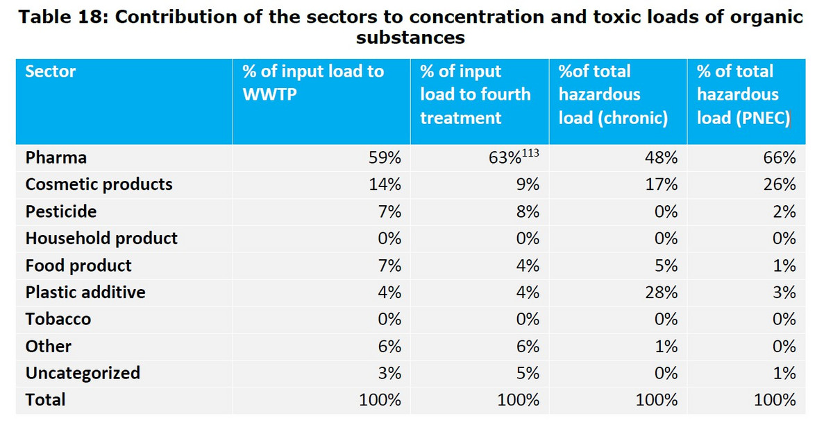 Pistocchi et al. haben 2022 eine Studie veröffentlicht, um die Effizienz von verschiedenen Technologien für die 4. Reinigungsstufe zu untersuchen. Hierbei wurde auch eine Liste von 1337 Chemikalien erstellt, die einen Großteil der im Abwasser vorkommenden schädlichen Mikroverunreinigungen darstellen sollen. Jedoch machen die Autoren keine Aussagen zu dem prozentualen Anteil einzelner Industriesektoren. Darüber hinaus weisen die Autoren in der Publikation selbst auf die Limitierung der Daten hin: „Leider gibt es kein eindeutiges Kriterium, um zu entscheiden, ob eine bestimmte Liste von Stoffen ausreichend repräsentativ für alle bedenklichen Chemikalien ist. “ (S. 3)