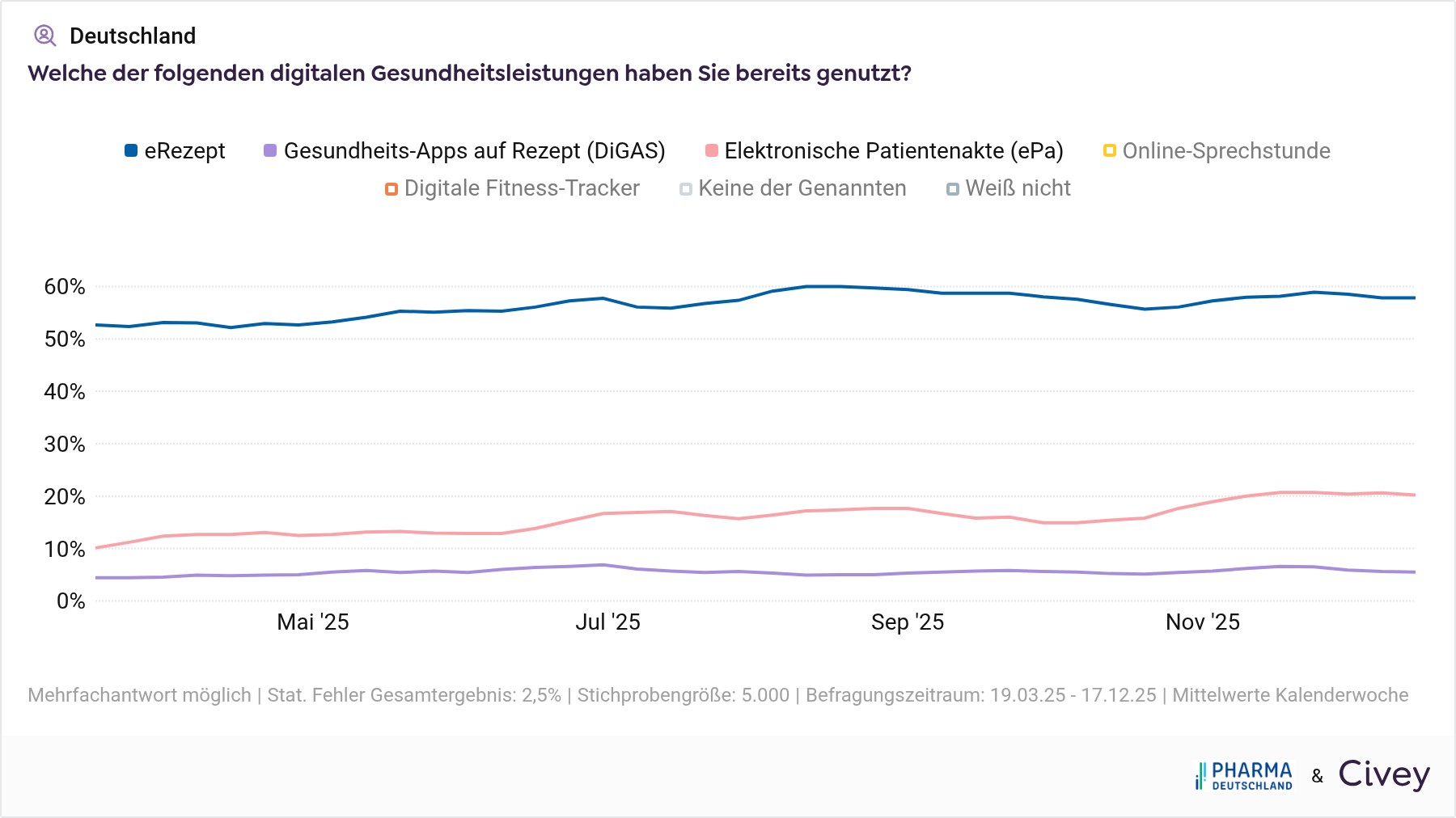 Mit 86,9 Prozent Bekanntheit und knapp 60 Prozent Nutzung ist das E-Rezept die etablierteste digitale Anwendung im Gesundheitswesen. Allerdings stieg die Zahl der Nutzer in den vergangenen sechs Monaten nur leicht von 55,7 Prozent auf 59,3 Prozent (Stand: 04.12.2025). Die elektronische Patientenakte (ePA) verzeichnete hingegen einen deutlicheren Zuwachs: Von 12,1 Prozent im Juni auf 20,3 Prozent Anfang Dezember. Die Gesundheits-Apps auf Rezept (DiGAs) sind weniger als einem Drittel der Bevölkerung (27,0 Prozent) bekannt und werden lediglich von 5,4 Prozent genutzt.